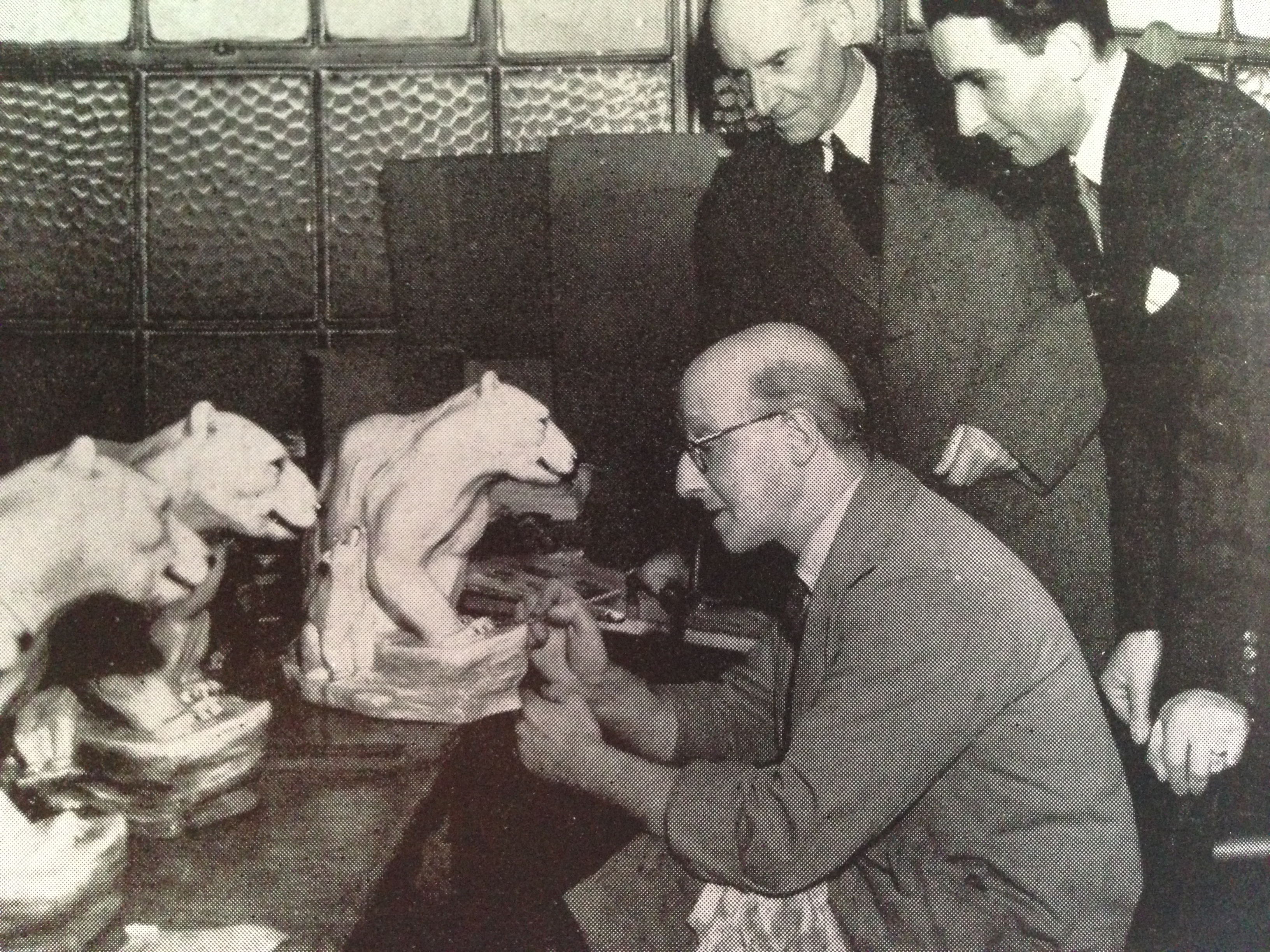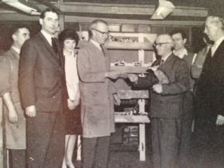 In his later career, Eric was responsible for painting prestige pieces, which were made to order. Here he is seen collecting a cheque and gifts from his friends at Doulton, including a naturalistic fox painted by himself!