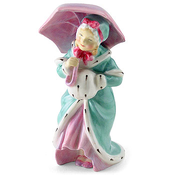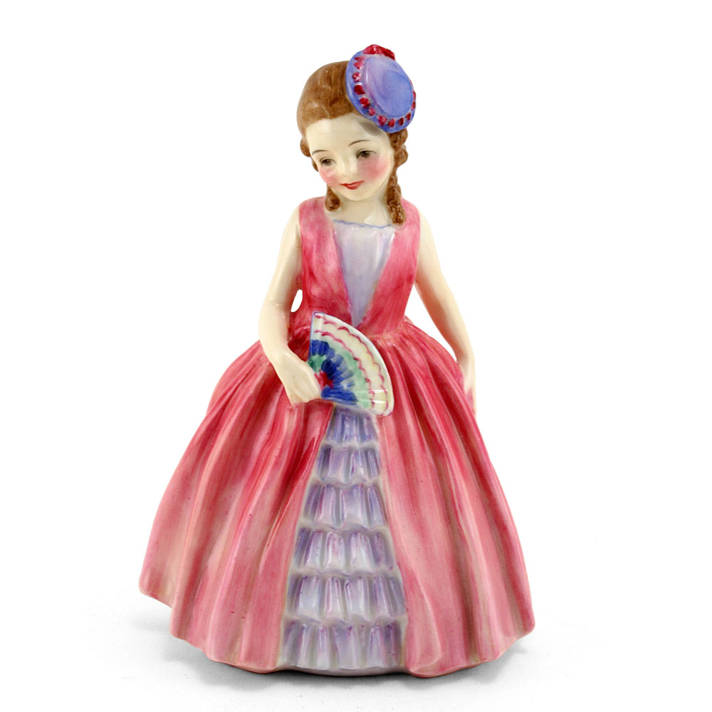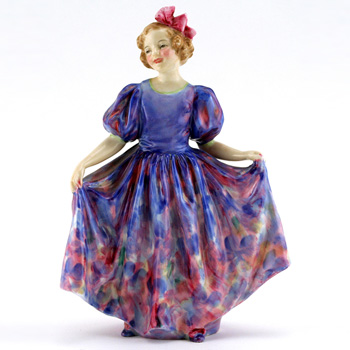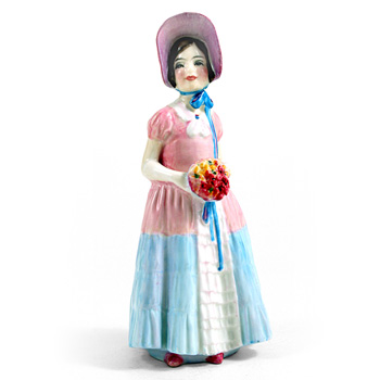 One particularly popular child figure is Marie HN1417 introduced in 1930. A purple version of this figure was made up until 1988. Originally made as a pair to Rose HN1368, they can both be found in complimentary as well as contrasting colorways, and more unusually you can find them mounted on bookends and other objects. The enduring popularity of Rose meant that a new colorway HN2123 was introduced in 1983.