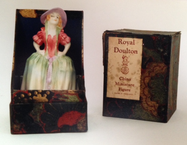 As well as the opportunity to collect this large size, Doulton introduced a miniature version in  1932 with  M7 to compliment her larger counterpart. These original M figures were sold in suitably deco boxes like the one here.