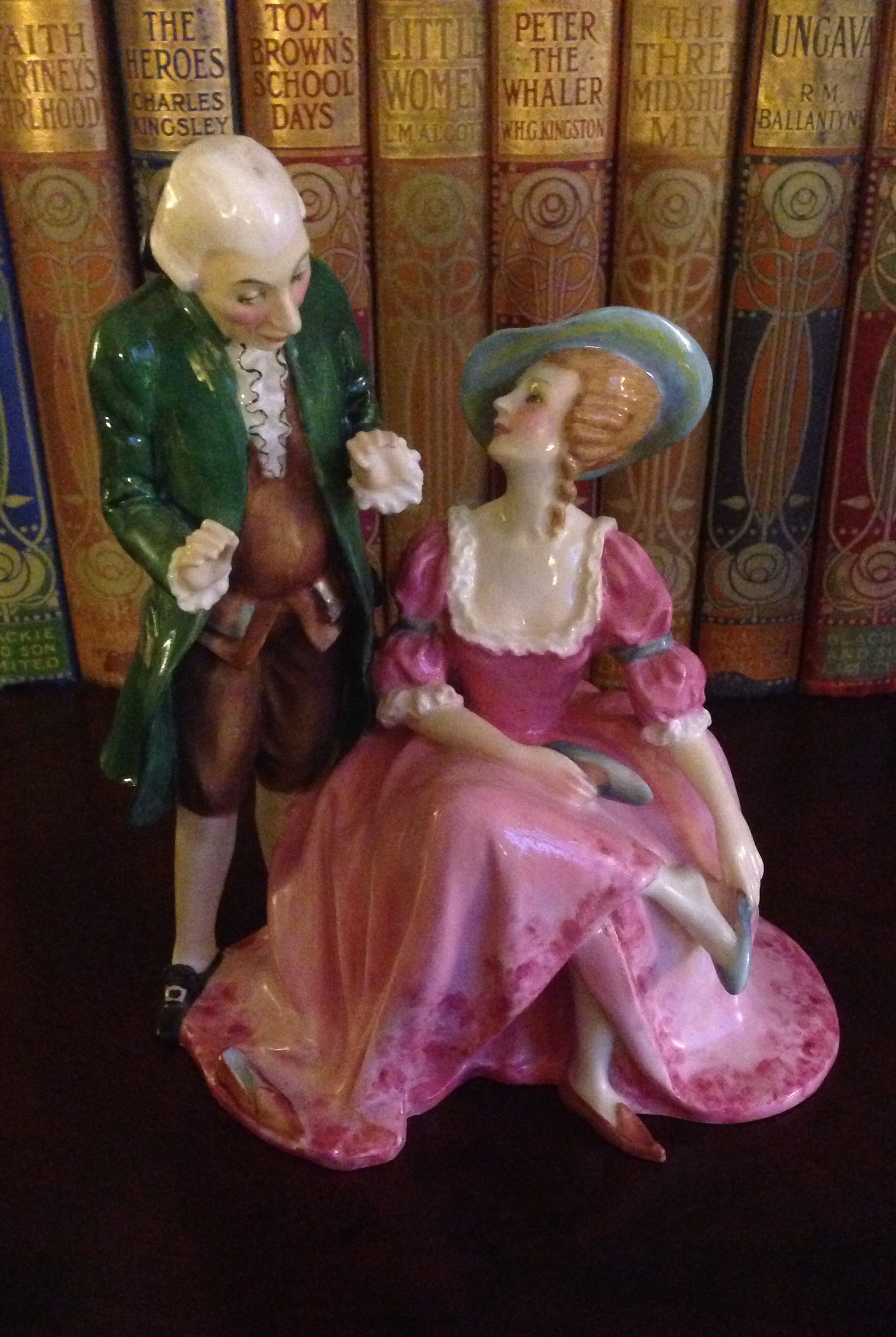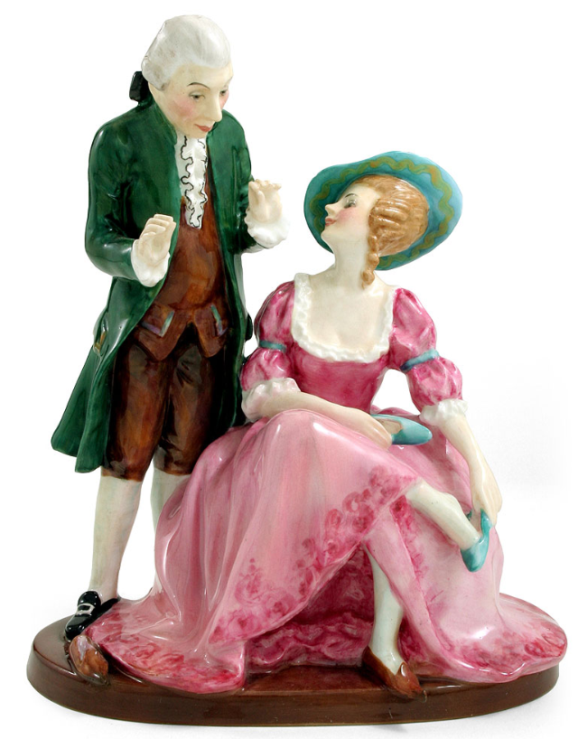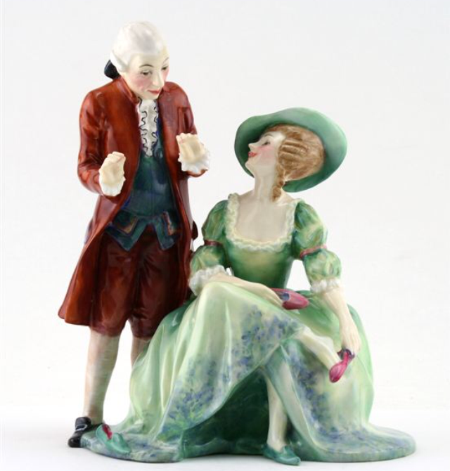 Introduced in 1936, the Court Shoemaker is a typical example of a 1930’s Doulton figure in that the detail in the figure is superb. It is also an example of a double figure popular during this decade. This piece was almost double the price of a standard figure from this period and given the relative scarcity, few can have been made.