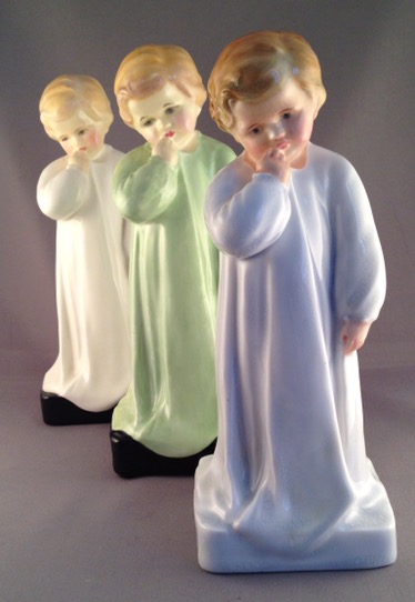 Designed by Charles Vyse who would later inspire Doulton’s famous balloon sellers, Darling was produced in his original size of 19cm in four colourways – HN 1 in a pale blue grey nightshirt, HN 1319 in a white nightshirt with black base and then HN 1371 and 1372 in green and pink nightshirts respectively and both with black bases. Of all these originally size models it is HN 1371 and 1372 which are the particularly rare examples.