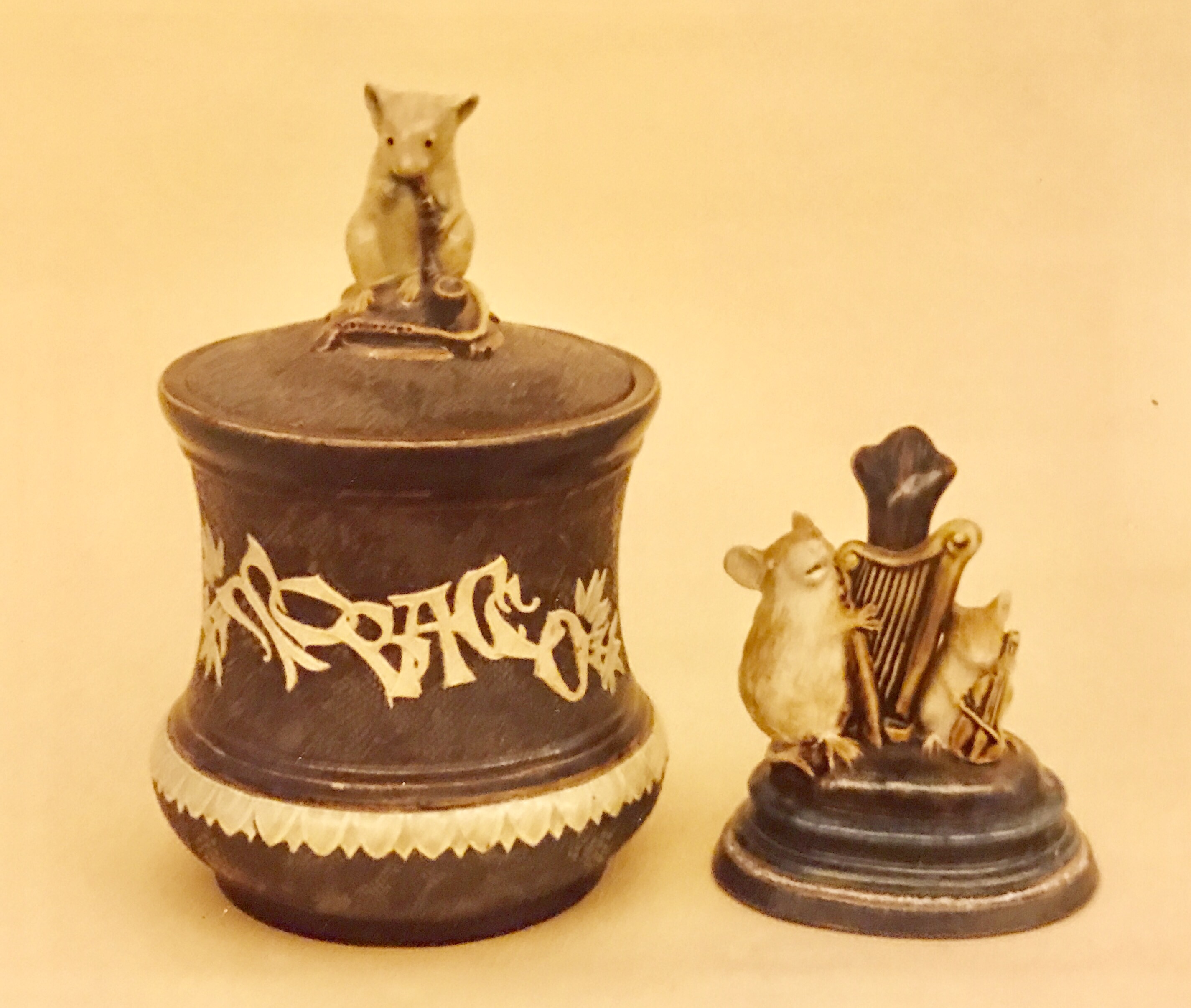 Tinworth designed tobacco jar and a Tinworth menu holder c.1885.