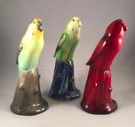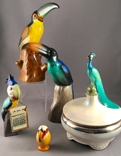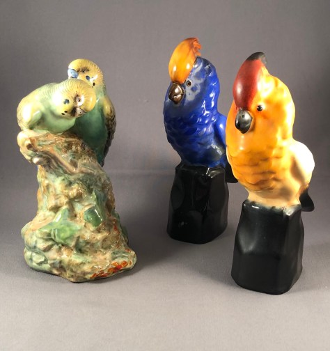 A selection of rare Royal Doulton birds including a character parrot (far left) holding a perpetual calendar in its mouth!