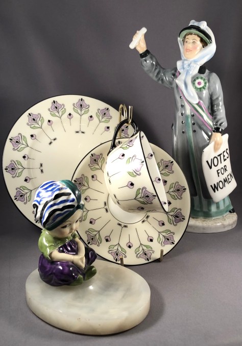 The legendary colour combination of green (Give), white (Women) and violet (the vote) across the years on Doulton Burslem wares!