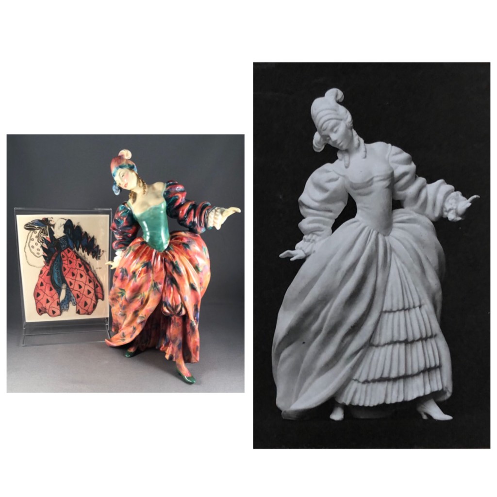 Despite us postponing the event here is a glimpse into the story behind one of the star lots of the exhibition – this prototype figure based on a costume design by Leon Bakst! His designs influenced not only figures themselves but also decorating styles with many early 20s figures featuring his style of sharply contrasting fabric designs.