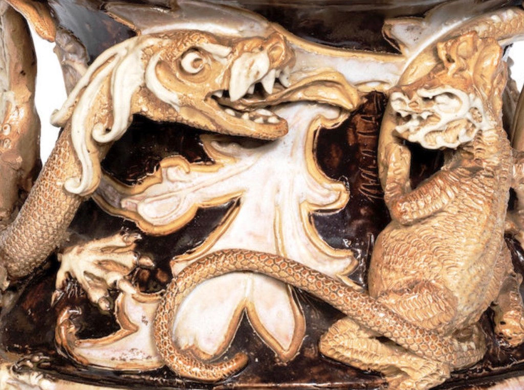 Such is the case with this outstanding Mark V. Marshall vase that is coming up at Bonhams 11.08.20 (lot108). Impressed with the all important MVM signature, it also carries assistant marks for Florrie Jones, together with the Royal Doulton stamp as well as ‘Art Union of London’ impressed into the base.