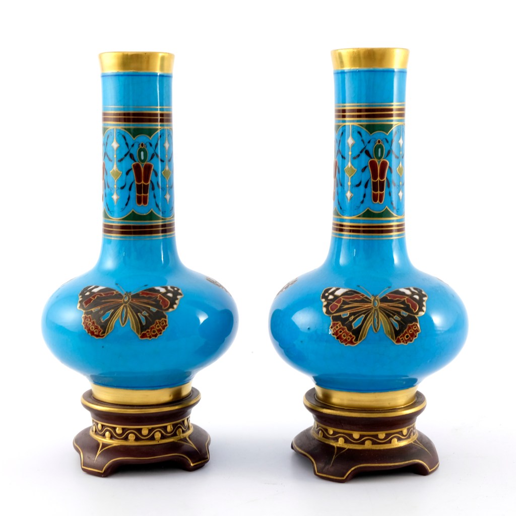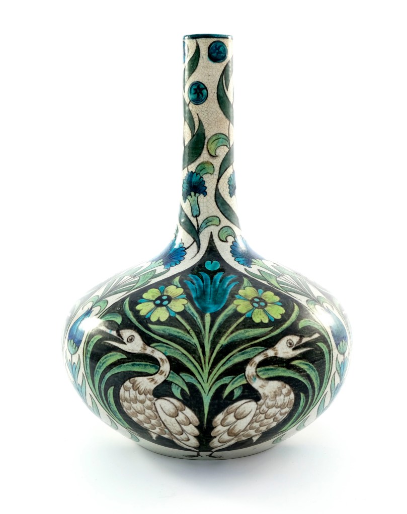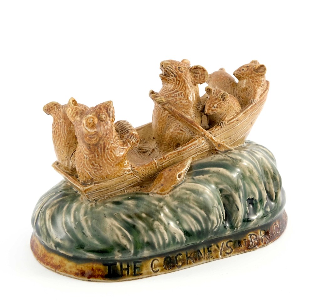 Illustrated from left to right. Lot 434: Gordon Forsyth Pilkington lustre alms dish. Est £2,000-4,000 Lot 38: A William De Morgan Persian double swan vase, circa 1892. Est £3,000-5,000 Lot 436: Gordon Forsyth of Pilkington, an exhibition relief moulded St George vase. Est £20,000-30,000 Lot 112: George Tinworth for Doulton Lambeth, mouse group – The Cockneys at Brighton, 1886. Est £2,000-4,000 Lot 2: Christopher Dresser for Minton, pair of butterfly vases, 1870. Est £800-1,200