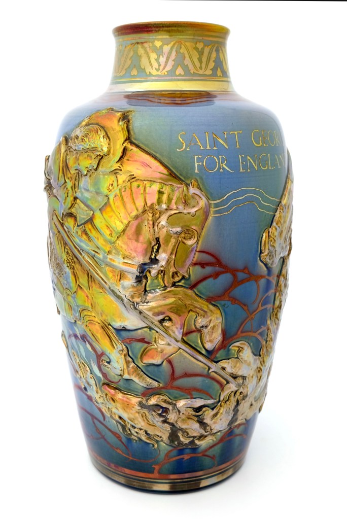 Cotswold Auctioneers, Kinghams are proud to announce they have been appointed to handle the most comprehensive and important collection of British art pottery built up over a fifty-year period. The sale of The Anthony J. Cross Collection of art pottery takes place on 11th/12th June at their Moreton in Marsh Auction Centre. Anthony’s fascination with ceramics began at a young age when his first purchase was a small Royal Worcester floral jug for £12.50. This modest purchase and after reading up on the subject, set him on a lifelong journey of collecting ceramics. From the outset he fell in love with the wondrous lustre wares of Pilkingtons. He widened the spectrum by learning about and acquiring examples of other notable makers such as Christopher Dresser, William De Morgan, Doulton and Bernard Moore. Encouraged by the eminent authority Richard Dennis OBE, Anthony made the decision that his collection would not be complete without key examples by the most revered and celebrated designers/potters. The 468 Lot auction showcases a rich and eclectic range of late 19th and early 20th Century British art pottery which will be auctioned over two days. Day one, (11th June) will open with examples of designs by Dr Christopher Dresser for Minton, Linthorpe and Ault, followed by tiles and hollowares by Della Robia and William De Morgan. Ruskin pottery and Bernard Moore wares are followed by an array of examples from the Doulton factory including works by noted designers the Barlow sisters, Charles Noke and George Tinworth to name a few. Examples by the highly sought-after Martin Brothers factory come in the form of a number of jardinieres, typical bird and other sculptural figures. Moorcroft from the Art Nouveau heyday to later and rare flambe pieces are also well represented. Day two, (12th June) will offer impressive glasswares by designers and glass houses such as Tiffany, Loetz and Rene Lalique. Pilkington is where Anthony’s true passion lies and it is here where one of the most important collections arrives on the open market, with many museum quality pieces on offer. The Pilkington factory was established in 1892 in Lancashire and employed many leading designers of the day, including Charles Voysey, Gordon Forsyth, Richard Joyce and William S. Mycock. The celebrated lustre wares were developed from 1906 and King George V granted the factory a Royal Warrant in 1913 with the firm being fashioned Pilkington’s Royal Lancastrian Pottery Company. On offer are numerous vases of varying shapes and sizes, chargers and tiles with pre-sale estimates ranging from £200 to £20,000. Of particular note is Lot 431, a 30cm high lustre jar and cover by Richard Joce from 1924, (estimate £3,000-5,000) and Lot 434, a lustre alms dish also by Richard Joyce and dating from 1909, (estimate £2,000-4,000). The most important piece in the auction is Lot 436, a 53cm high Gordon Forsyth lustre vase dating from 1908. Moulded in relief with St George on horseback lancing a dragon with a maiden to the side, the vase incorporates an exuberant bronze and red iridescent glaze and is inscribed ‘St George for England’. With pedigree provenance, it was exhibited at the 1908 Franco British Exhibition to much admiration and only two examples are known to have been produced. It carries a pre-sale estimate of £20,000-30,000. Viewing will take place on Wednesday 9th June from 10am to 5pm, Thursday 10th June 10am to 7pm and auction days from 9am to 11am with the auction commencing at 11am on each day. The fully illustrated printed catalogue can be purchased (£18 by post) or viewed online at www.kinghamsauctioneers.com. Live internet bidding across four different platforms, absentee and phone bids can be arranged. For further information, please contact George Kingham on 01608 695695 or email enquiries@kinghamsauctioneers.com