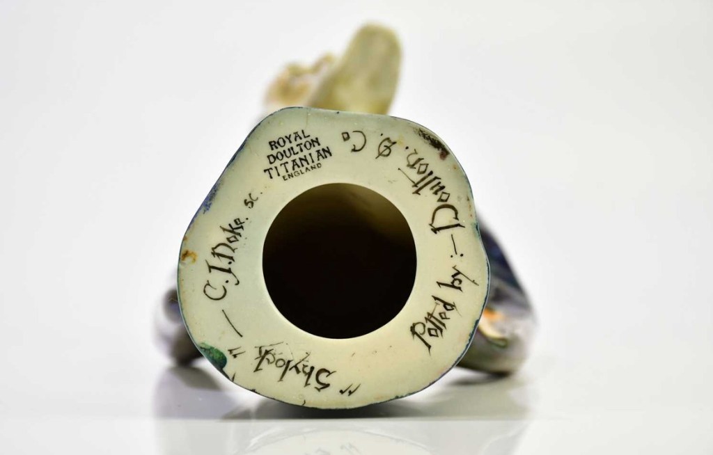 Returning to our example in hand – you can see that the piece is marked underneath Titanian and that is because this body was used in a selection of early figures from Spook HN50 through to A Mandarin HN382. There is no particular rhyme as to why a Titanian body was used other than the suggestion that the decorating technique may produce a richer result. A further example HN 317 has been discovered and even a completely lustred one.