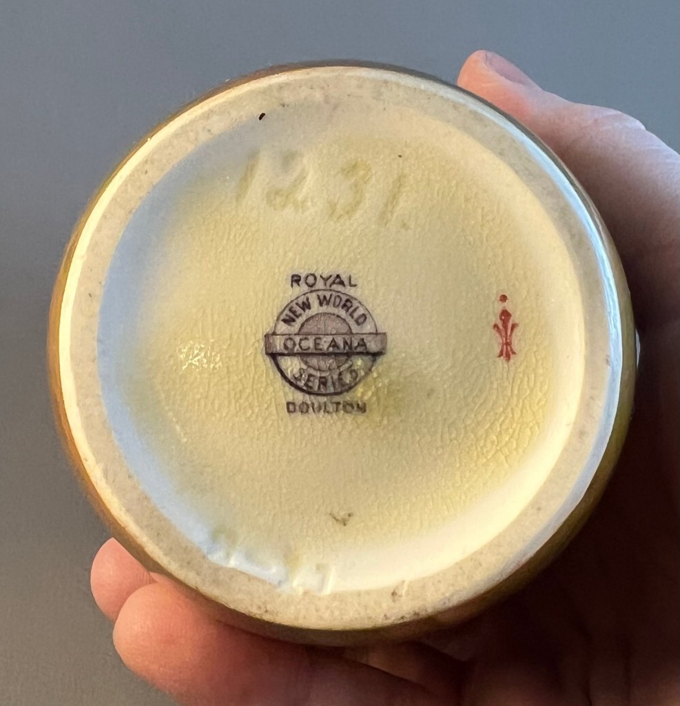 A rare Royal Doulton New World Series vase with gilded decoration. On the base there is a pink cypher differentiation it from more Transfer printed examples. Note the pink cypher at 3 o’clock in the above image. You can clearly also make out the vase shape number 1231 and the impressed date of manufacture for August 1911.