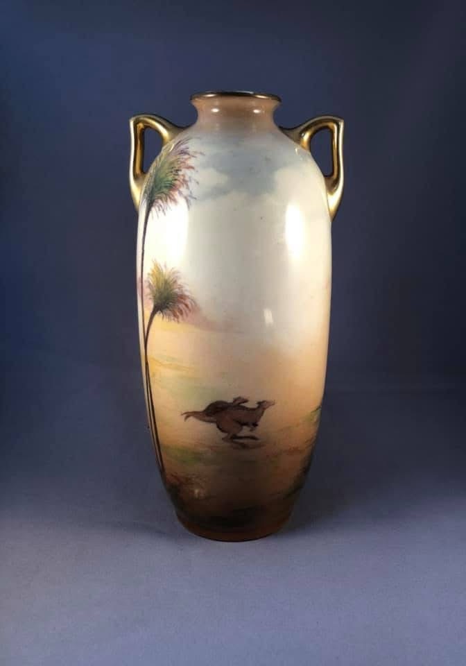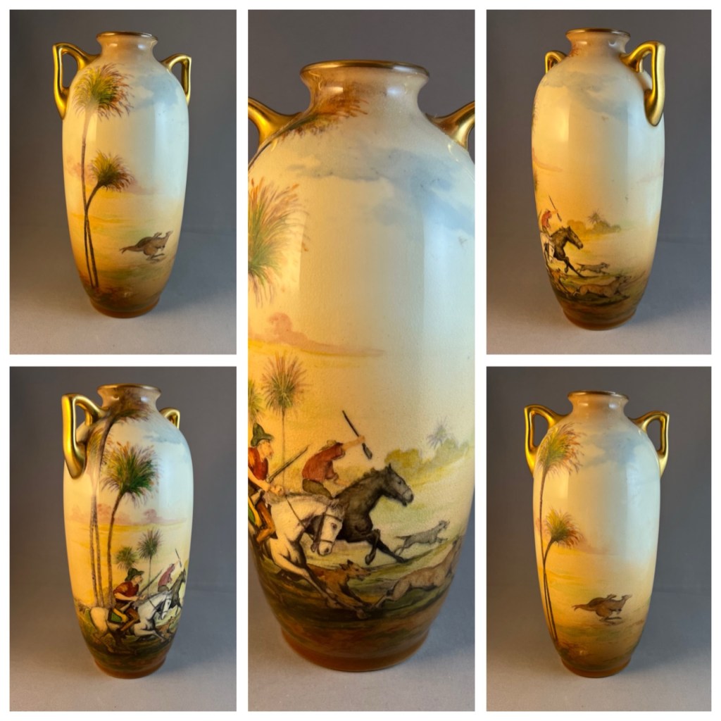 It is indeed strange to associate camels with Australia but if you are unfamiliar with the history of this great country, camels were brought to Australia in 1840 to work in the arid regions. The unexpected subject matter may explain why so few examples in this design have been discovered, as we have simply not recognised the subject matter illustrated. Perhaps a more typical scene is on the other vase that features kangaroos being hunted.