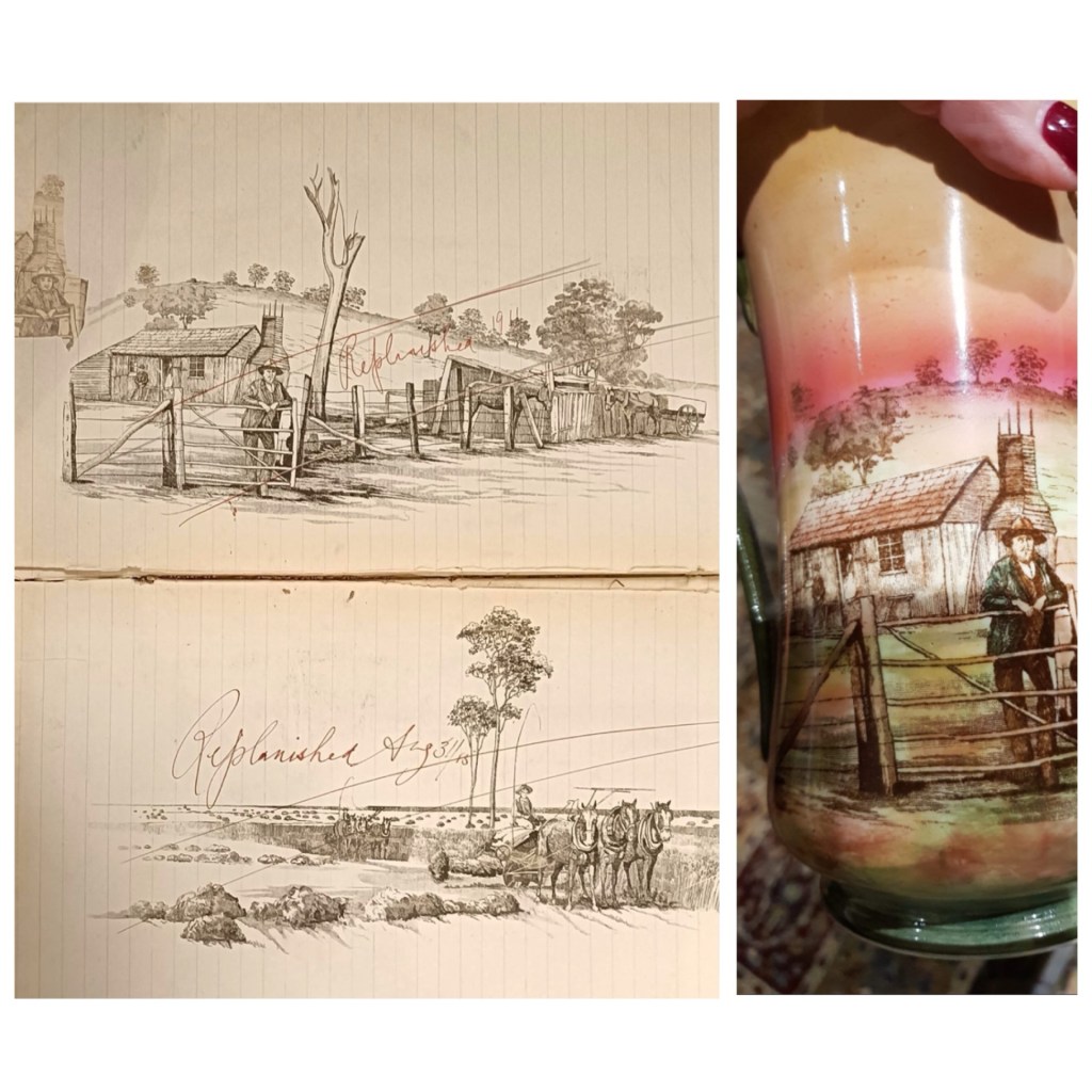 Mirror scenes from a copper plate book and the finished article seen on a vase. The colour palette too suggests Australia.