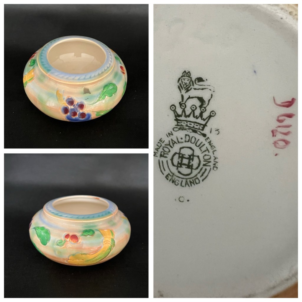 Note the typical Royal Doulton green used on the handles, rim and base as opposed to the gilded decoration on the other example illustrated.