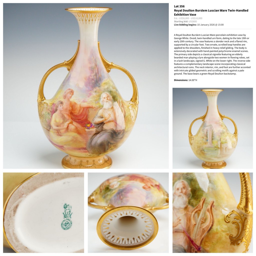 White painted one of the famous Diana vases for the 1893 Chicago Exhibition and also a Dante vase in collaboration with Chares Labarre. In the Doulton Burslem wares book Desmond Eyles notes that a large vase by White titled Titania was made specifically for Prince Rajitsingh.