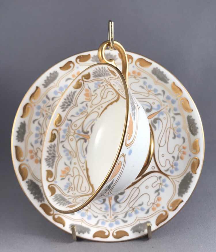 A delicate cup and saucer in the Lactolian technique dating to 1902 and carrying an RA number too, telling us today that it came from the studio of Robert Allen.