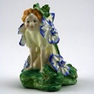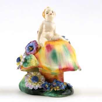 Doulton produced at least 7 different figures of fairies from standing with wings, to perched on toadstools to simply hiding in the undergrowth. Each is a charming study of childhood and many were available with differing flowers and even different colourways during their short production in the 1930’s. Certainly the second and sixth versions are the same child as ‘Boy on Pig’ HN1369 attributed to CJ Noke rather than Harradine. There are a further 6 fairies listed but which did not go into production.