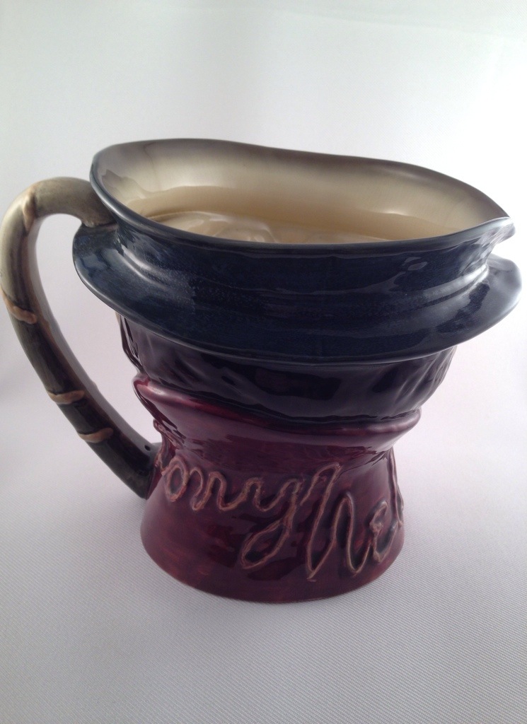 This small group of five musical character jugs, fall into this category. Production of these musical jugs was interrupted by the outbreak of the war and musical jugs were probably not made long after its commencement, given their scarcity in today’s market place. This is borne out particularly by the scarcity of the Old King Cole jug.