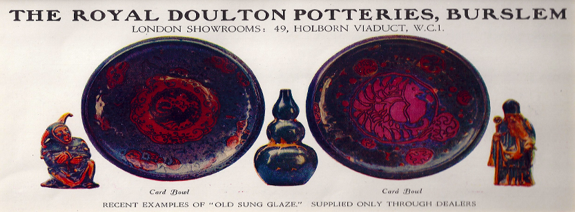 These pieces were painted principally by Harry Nixon, Arthur Eaton and Fred Moore. Sung glazes can be found on Buddhas, as can also be seen here in this advert from the 1920’s, a handful of suitable early figures from the HN range such as A Spook, as well as animals, in particular elephants, a favourite of Charles Noke can also be found.
