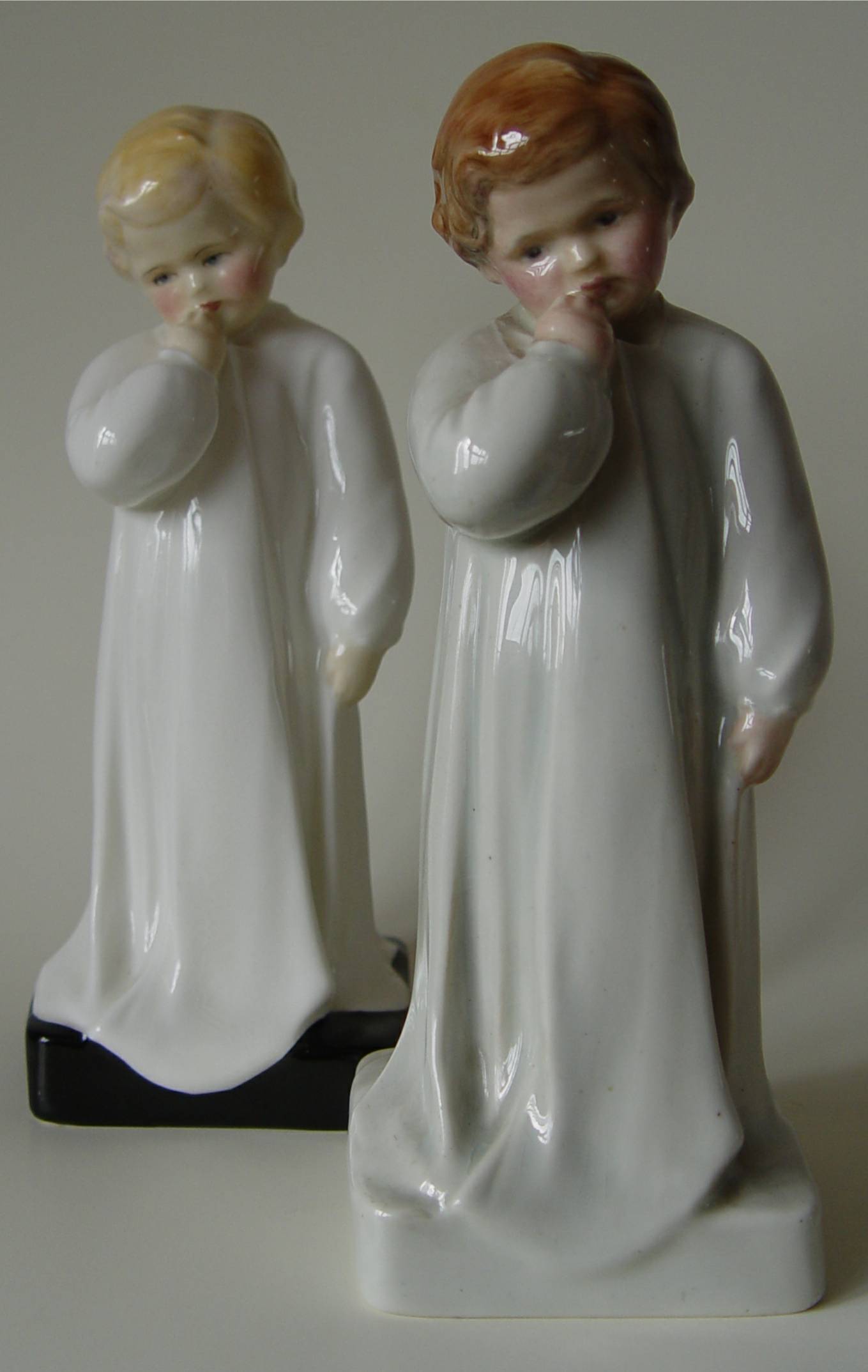 The fact that several of these key figures within the HN collection remained in production until close to the millennium confirms the popular demand the world over for child studies, something that Doulton to this day continues to ‘feed’ with the introduction of new child studies. As seems to always be the case imitation should be construed as flattery and so to finish, here is a version of Darling made by another Staffordshire pottery next to a Doulton version from 1934 – the quality of the Doulton model leaps out.