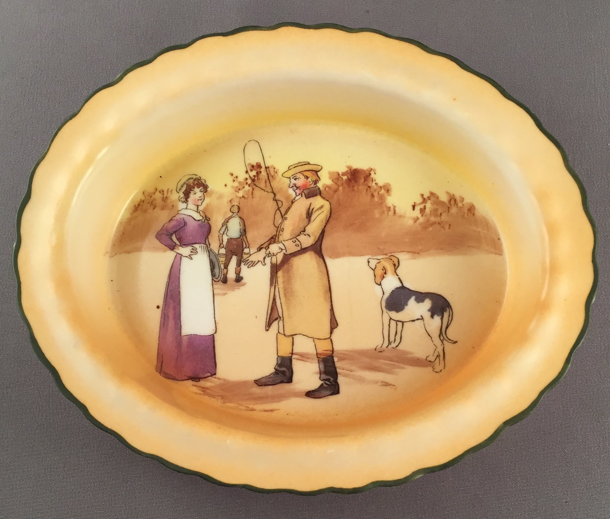 Unusual scenes do turn up such as the one on the small pie crust dish. Labelled as E3804, it is an unusual find and on china too, hence the E number.