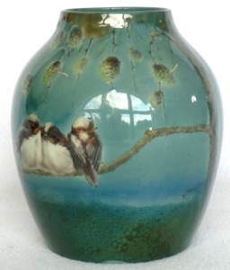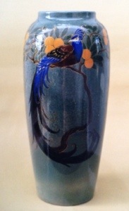 It was often used as the background to Doulton’s fine porcelain wares that were painted with typically birds but also oriental figures and flowers by leading artists including Harry Allen, F. Henri and Harry Tittensor.