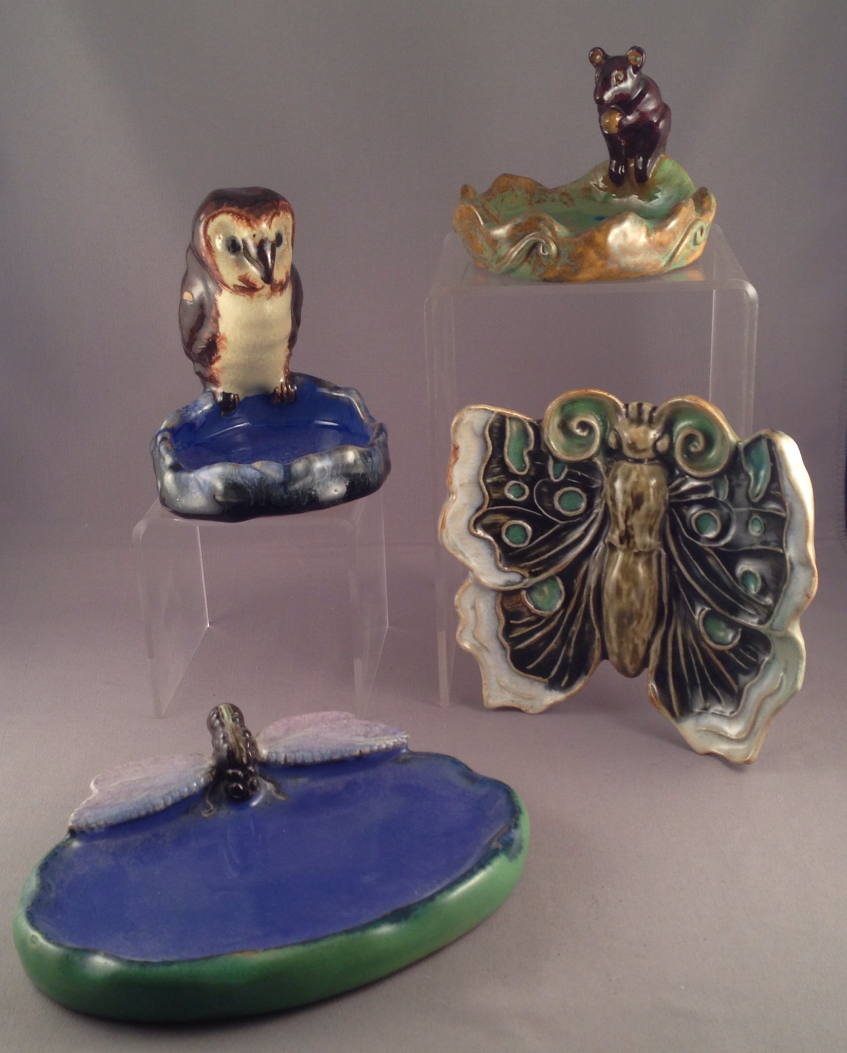 The term bibelot is a derivative from the French, meaning a trinket or small fanciful object. One only needs to look at the subjects of these fanciful trays to see that this name suits these imps, nymphs, comic birds and other creatures very well.