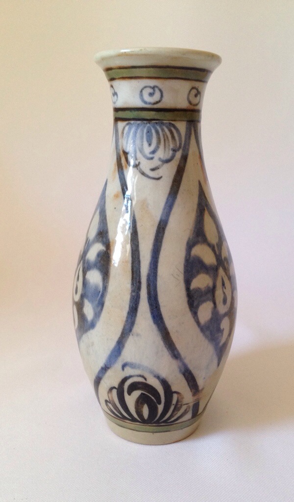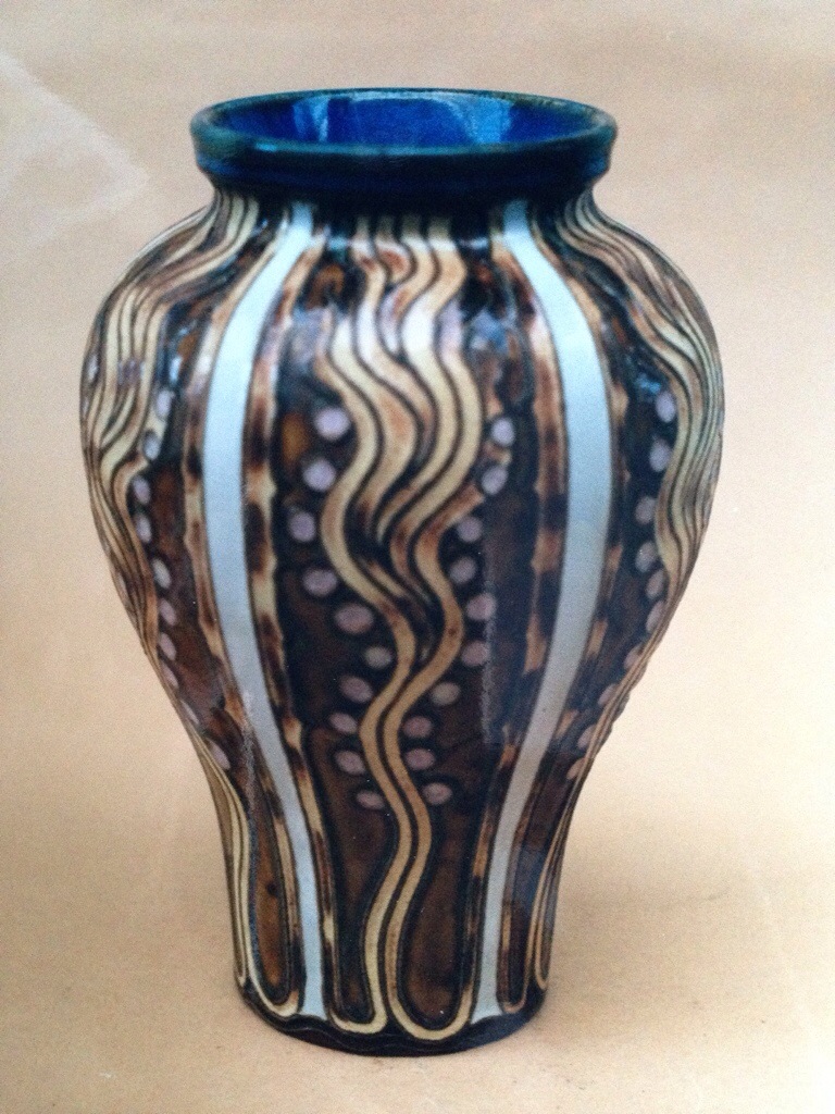 Up until the end of Simeon’s association with Doulton in 1936, his style remained versatile, producing in the 1920’s designs for the Persian ware range and also a myriad of slip ware pieces in a colourful pallet.