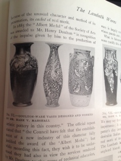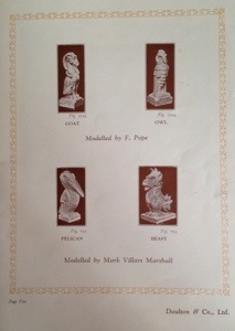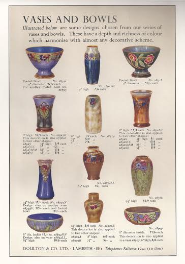 Below is an excerpt  from a Doulton brochure from the deco period. As you can see there was an emphasis on colour and shape. More interestingly is the fact that Doulton chose to advertise just pieces which could be reproduced rather than artist pieces – it was after all in business to sell, sell, sell. These production pieces, or ‘Late Editions’ as they have become known were of course designed by Lambeth’s major artists including Mark Marshall, Francis Pope, Leslie Harradine and Margaret Thompson amongst others.