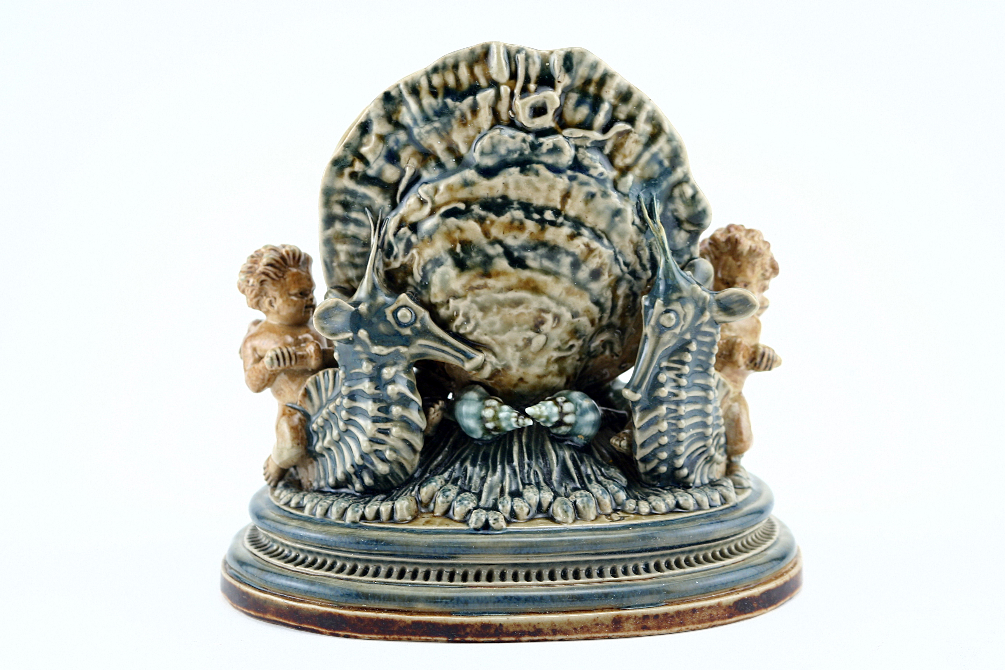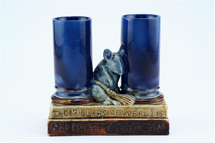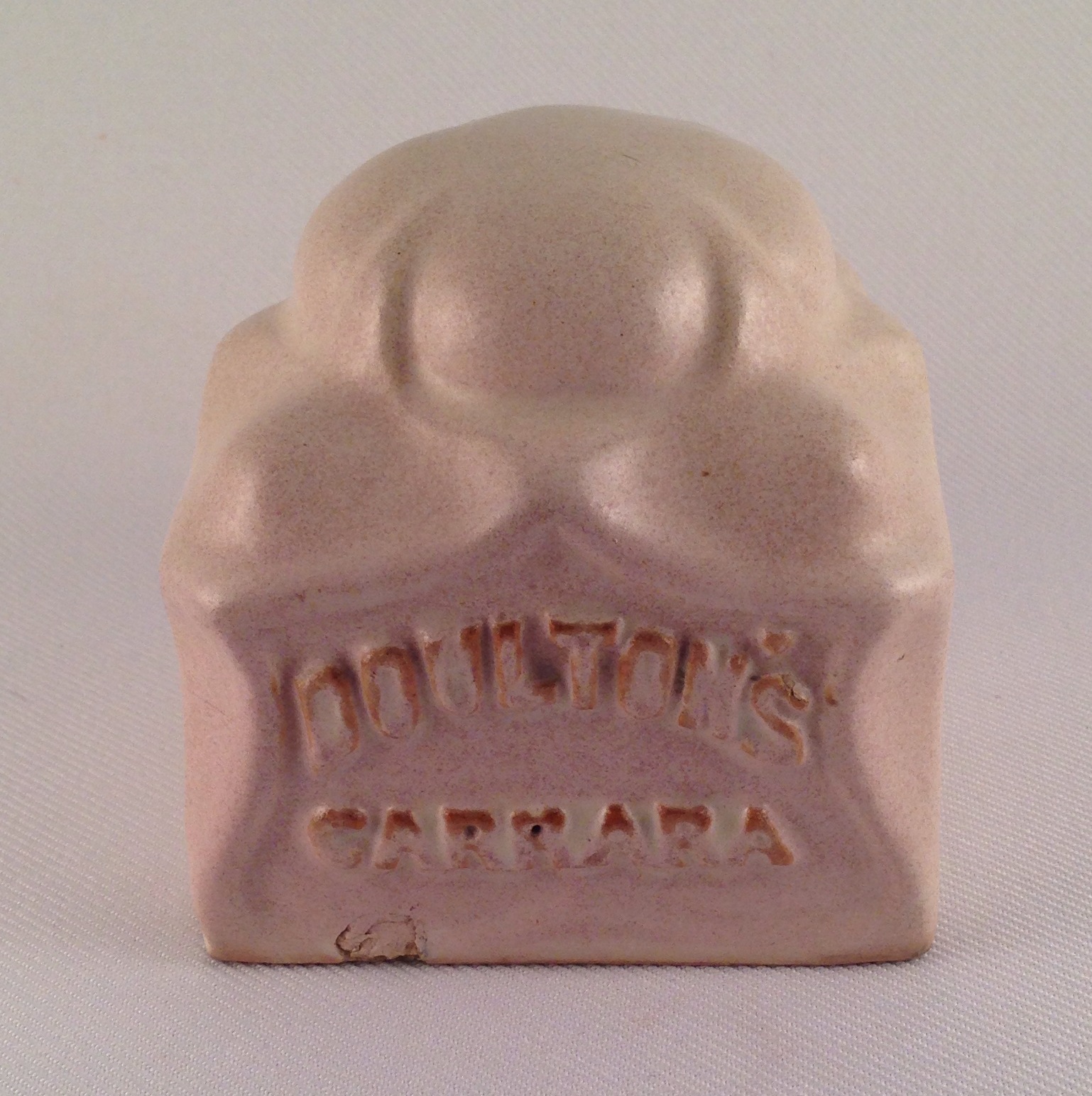 Paperweights and desk accessories were a staple of the Lambeth factory and indeed Tinworth’s mouse on currant bun was so popular it was re-issued in 1913 to mark his death. I have in my own collection a bizarre Cararra advertising paperweight too. The possibilities as we all know with Doulton, are as always endless.
