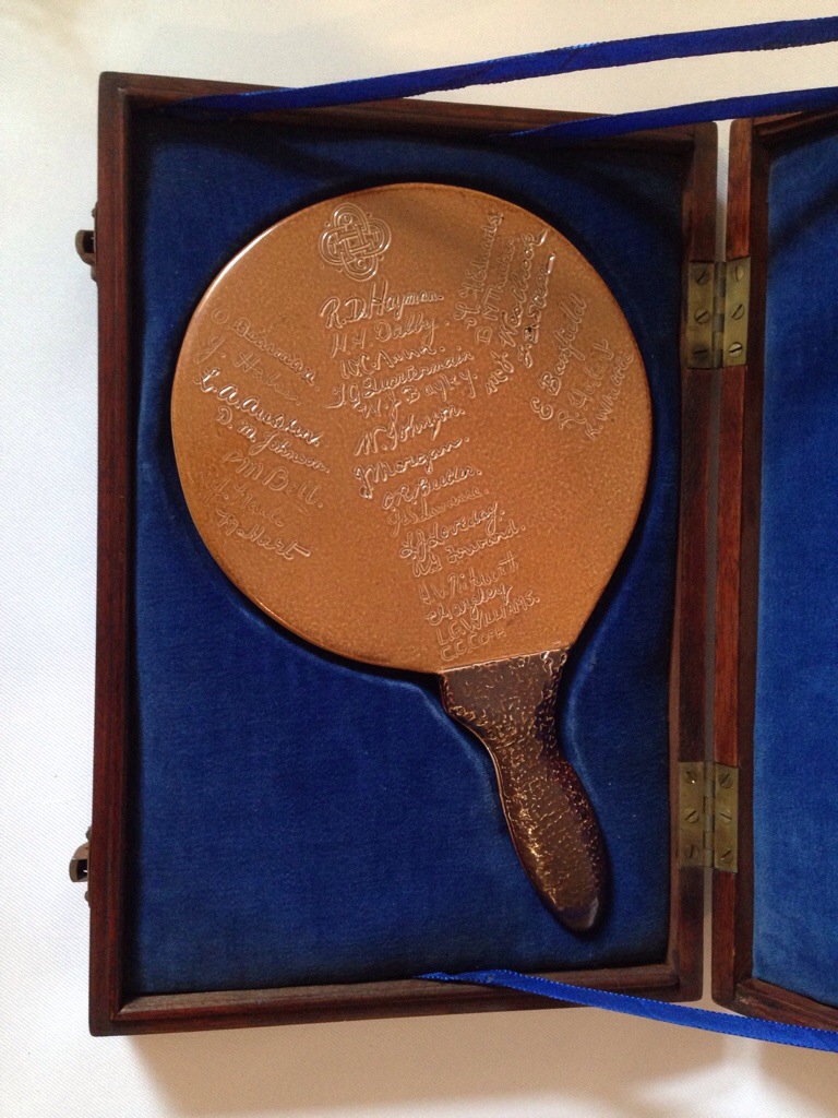 One piece of stoneware I have at home is a fun Doulton stoneware table tennis bat presented by Mott’s fellow players to him in 1935, and signed by them all.