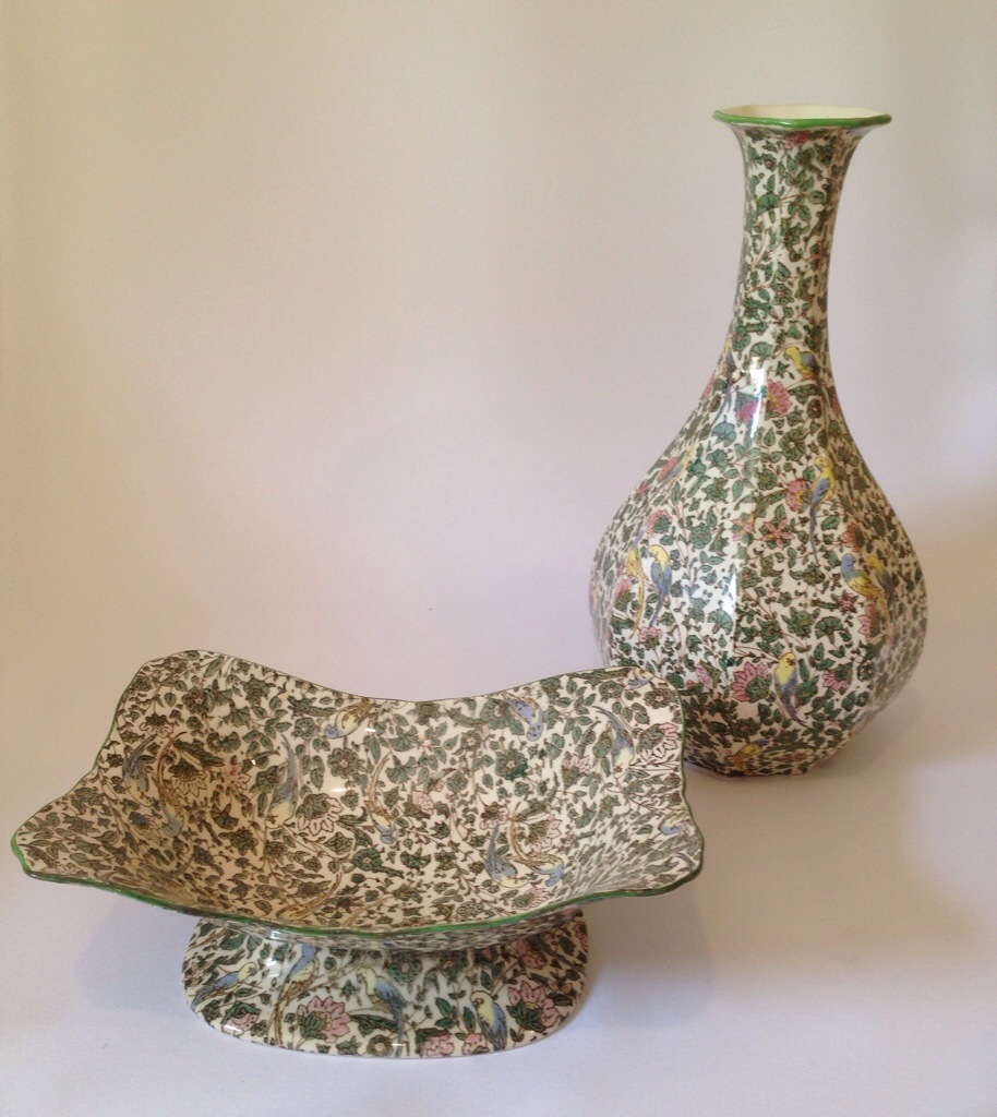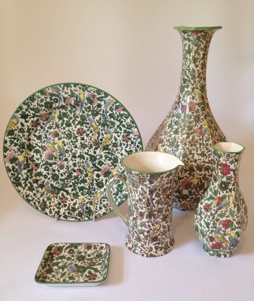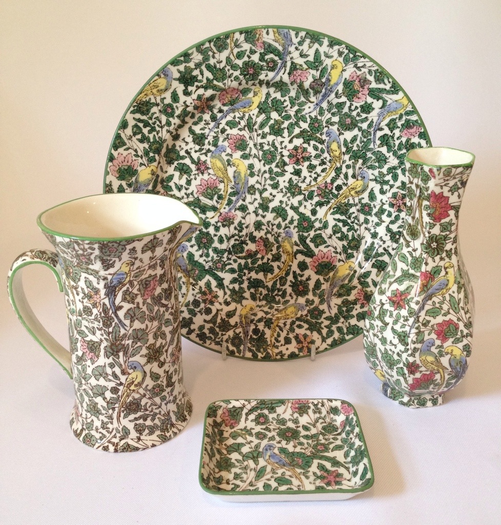 Typically of Doulton’s seriesware unusual items turn up from time to time. Only yesterday I saw a hat pin stand in this pattern. Other items that have turned up range from usual Doulton style vases to dressing table sets to tea sets.