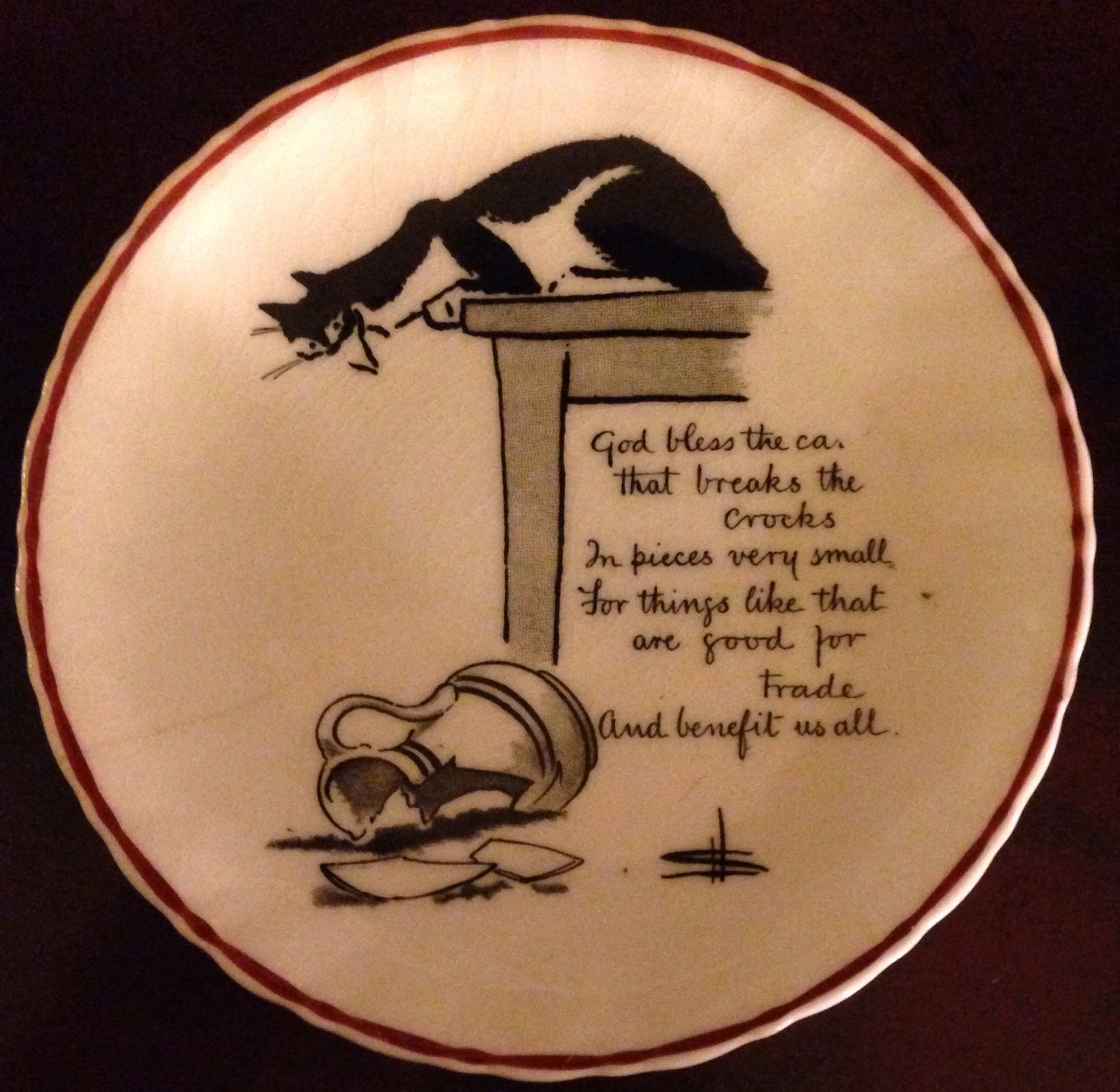 Perhaps the most easily found items featuring this unusual cat are the two pin trays each featuring the saying ‘God bless the cat that breaks the crocks in pieces very small, for things like that are good for trade and benefit us all’. Naturally these pin trays, available in a circular or rectangular shape were produced for the trade and available between 1906 and 1939.