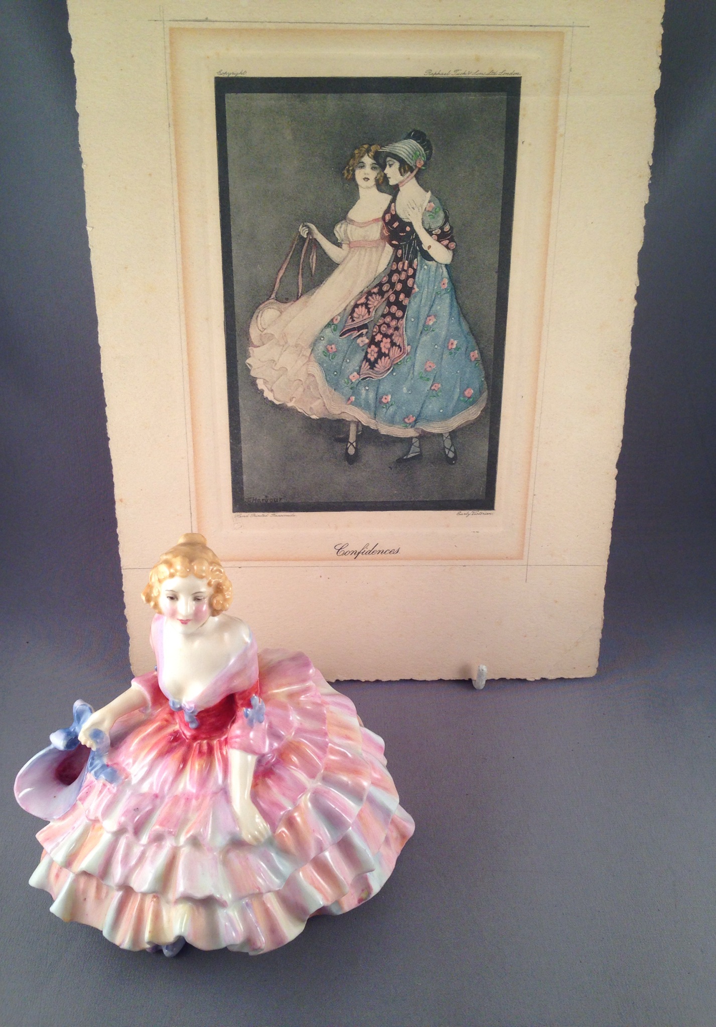 Above you can see Tildy HN1576 together with her inspiration drawn by Jennie Harbour who provided many such ladies for Harradine; whether she was aware of this is unknown. (The Doulton lady is taken from the lady on the left.) Yet, Doulton did have some agreement with Raphael Tuck the publisher of these Jennie Harbour pictures, although correspondence between the two firms that exists only refers to pictures by Stanislaus Longley and Molly Benetar.