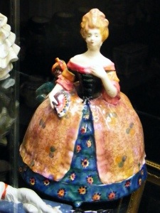 This original illustration is by the popular illustrator Jennie Harbour and clearly is the source for Tittensor’s Lady and Blackamoor. Interestingly this example spotted at the Seaway China/Whitley event in Detroit 2009, is modelled as a powder bowl and the base separates from the rest to provide a place for the powder and puff! The colouring of HN375 is identical to that of HN374, but the former indicates that it is modelled as a powder bowl.