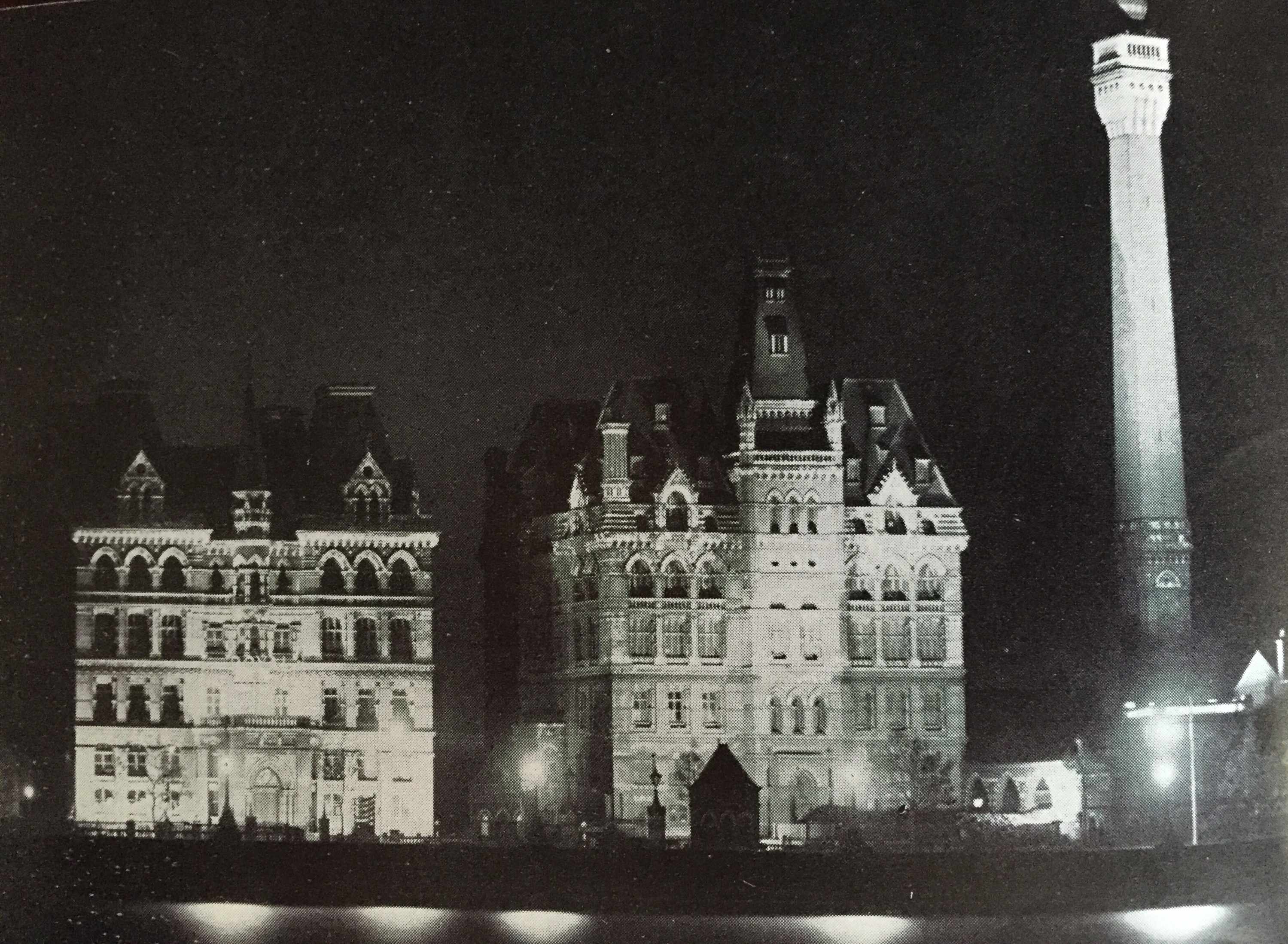 A floodlit view of blocks A and B from 1935 celebrating a Royal jubilee.